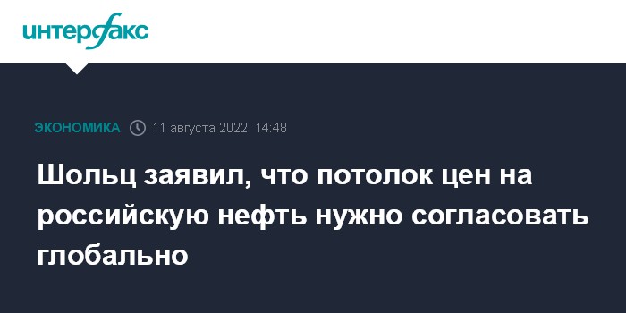 Москва. 11 августа. INTERFAX.RU - Потолок цен на российскую нефть нужно согласовать с большинством международного сообщества, заявил на пресс-конференции канцлер Германии Олаф Шольц.