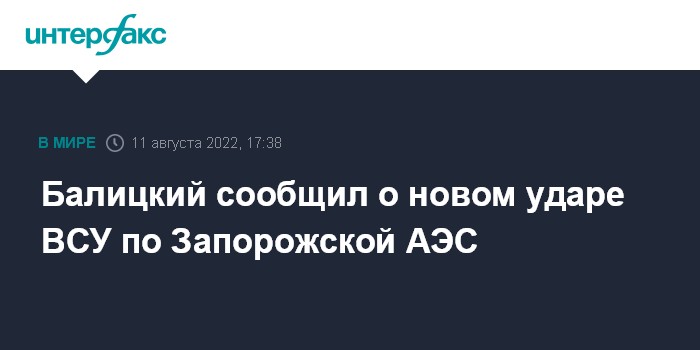 Москва. 11 августа. INTERFAX.RU - Вооруженные силы Украины нанесли в четверг удар по территории АЭС на подконтрольной РФ части Запорожской области, есть попадания около хранилища радиоактивных изотопов, сообщил глава временной администрации региона Евгений Балицкий.