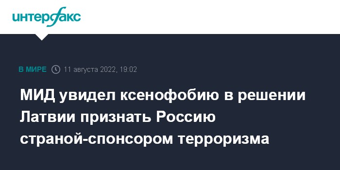 Сейм Латвии 11 августа признал Россию государством, поддерживающим терроризм. В документе, опубликованном на сайте парламента, предлагается и "другим странам-единомышленникам" поддержать эту позицию, ввести всеобъемлющие санкции в отношении России, а также поддерживающей ее Белоруссии, одновременно увеличив военную, финансовую, гуманитарную и дипломатическую поддержку Украины. Кроме того, латвийский сейм предлагает государствам-членам Евросоюза немедленно прекратить выдачу туристических виз и ограничить выдачу въездных виз гражданам России и Белоруссии.