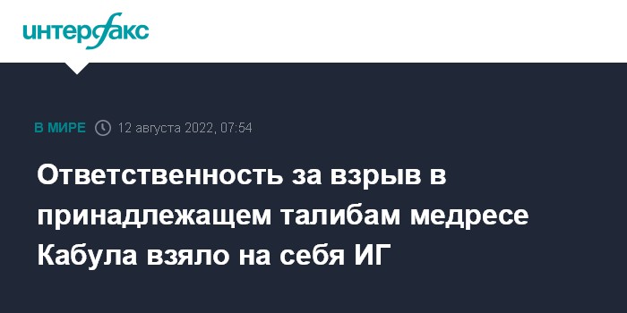 Москва. 12 августа. INTERFAX.RU - Террористическая группировка "Исламское государство" (ИГ, запрещена в РФ) взяла на себя ответственность за вчерашний взрыв в школе одного из старших священнослужителей движения "Талибан" (запрещенная в РФ террористическая организация) Рахимуллы Хаккани, сообщает информационное агентство Aamaj News.