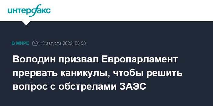 Москва. 12 августа. INTERFAX.RU - Председатель Госдумы РФ Вячеслав Володин предложил Европарламенту прервать каникулы для рассмотрения проблемы с Запорожской АЭС.