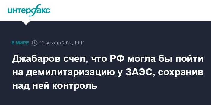 Минобороны РФ заявило о повреждении систем охлаждения ЗАЭС в результате ударов ВСУЧитать подробнее"Это разумное предложение о демилитаризации вокруг ЗАЭС, я думаю, мы это поддержим", - сказал Джабаров.