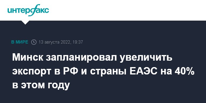 Москва. 13 августа. INTERFAX.RU - Белоруссия ставит задачу на 40% нарастить экспорт в Россию и страны ЕАЭС, заявил премьер-министр Роман Головченко.