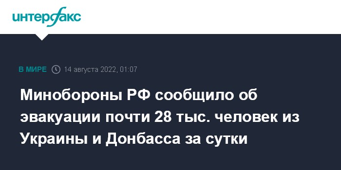 Москва. 14 августа. INTERFAX.RU - Российские военные за сутки эвакуировали из мест боевых действий на Украине и в Донбассе почти 28 тыс. человек, включая 4,5 тыс. детей, заявил начальник Национального центра управления обороной РФ Михаил Мизинцев.