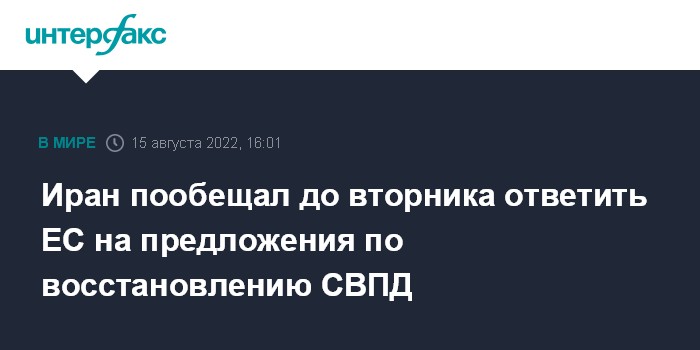 Москва. 15 августа. INTERFAX.RU - Иран до вторника в письменном виде уведомит ЕС о своей оценке предложений Брюсселя по восстановлению ядерной сделки, сообщил в понедельник глава МИД Ирана Хосейн Амир Абдоллахиан.