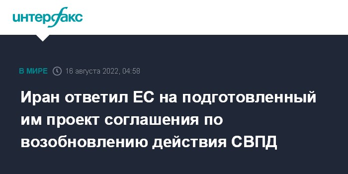 Москва. 16 августа. INTERFAX.RU - Иран направил Евросоюзу официальный ответ на предложенный ЕС проект соглашения о восстановлении Совместного всеобъемлющего плана действий (СВПД), сообщило иранское информагентство ISNA со ссылкой на информированный источник, не приведя подробностей.