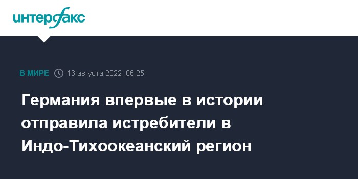 Москва. 16 августа. INTERFAX.RU - Германия в понедельник впервые в истории отправила истребители в Индо-Тихоокеанский регион, пишет Kyodo со ссылкой на Минобороны ФРГ. Самолеты будут сопровождать флот, направленный для совместных учений в регионе.