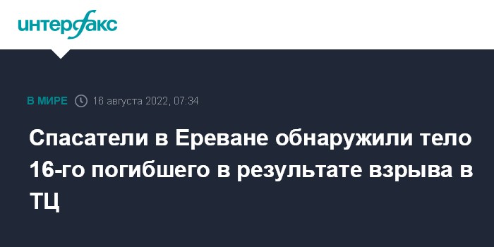 Москва. 16 августа. INTERFAX.RU - Число жертв в результате взрыва в ереванском торговом центре "Сурмалу" достигло 16 человек, сообщает МЧС Армении.