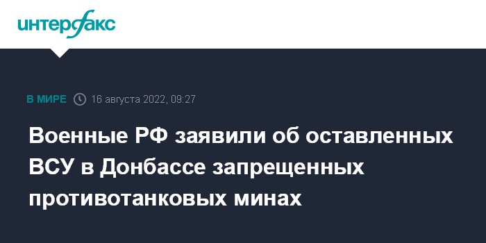 Москва. 16 августа. INTERFAX.RU - Российские военные сообщили об обнаружении на оставленных позициях украинских сил мин французского производства, которые запрещены Женевской конвенцией.