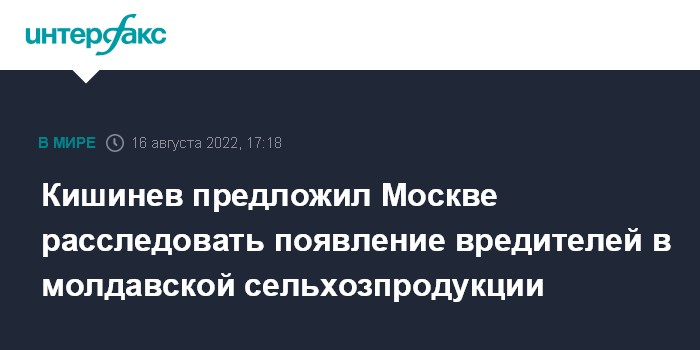 Москва. 16 августа. INTERFAX.RU - Министр сельского хозяйства и пищевой промышленности Молдавии Владимир Боля предложил российскому послу Олегу Васнецову создать рабочую группу с участием национальных и российских экспертов для расследования появления карантинных объектов в молдавской продукции растениеводства.