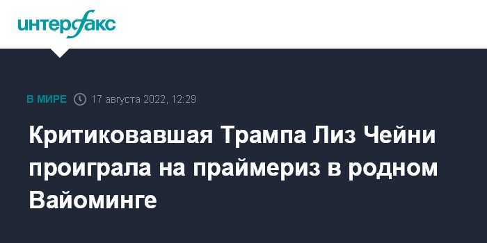 Москва. 17 августа. INTERFAX.RU - Член Палаты представителей США от республиканцев Лиз Чейни (от штата Вайоминг), считавшаяся одним из главных критиков экс-президента США Дональда Трампа, проиграла на праймериз в Вайоминге. Об этом сообщает в среду The New York Times.