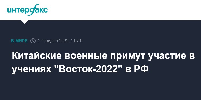 Москва. 17 августа. INTERFAX.RU - Народно-освободительная армия Китая (НОАК) примет участие в стратегических военных учениях "Восток-2022", которые пройдут на территории России с 30 августа по 5 сентября, наряду с Индией, Белоруссией, Таджикистаном и Монголией. Об этом сообщило в среду министерство обороны Китая, его цитирует канал CGTN.