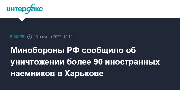 Москва. 18 августа. INTERFAX.RU - Российские военные нанесли удар по пункту базирования иностранных наемников в Харькове, уничтожив более 90 человек, заявил официальный представитель Минобороны РФ Игорь Конашенков.