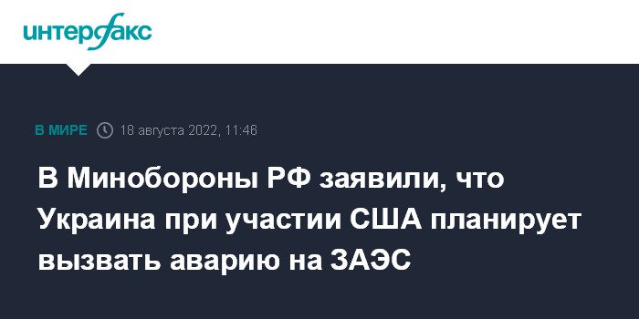 Москва. 18 августа. INTERFAX.RU - Министерство обороны России заявило, что Киев при участии Вашингтона планирует вызвать на Запорожской атомной электростанции аварию, обвинив в ней Россию.