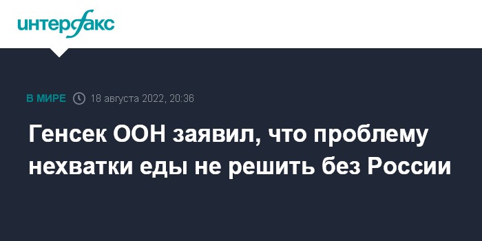 Москва. 18 августа. INTERFAX.RU - Генсек ООН Антониу Гуттериш заявил, что мировой продовольственный кризис не получится решить без обеспечения глобального доступа к российскому продовольствию и удобрениям, сообщает агентство "Анадолу".