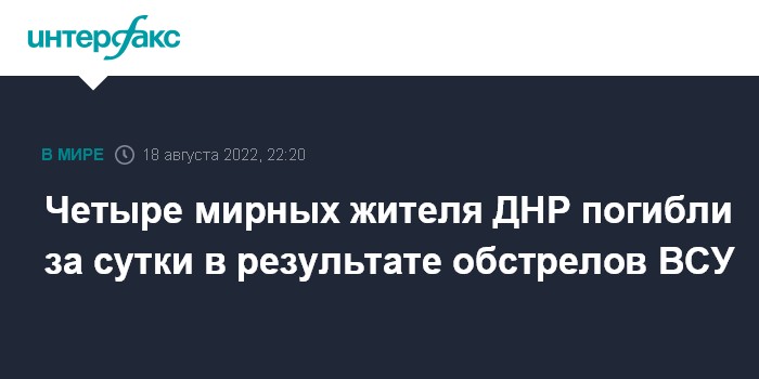 Москва. 18 августа. INTERFAX.RU - Четверо мирных жителей погибли, еще 23 пострадали в результате обстрелов территории ДНР с начала суток четверга. Такие данные приводит штаб территориальной обороны Донецкой народной республики.