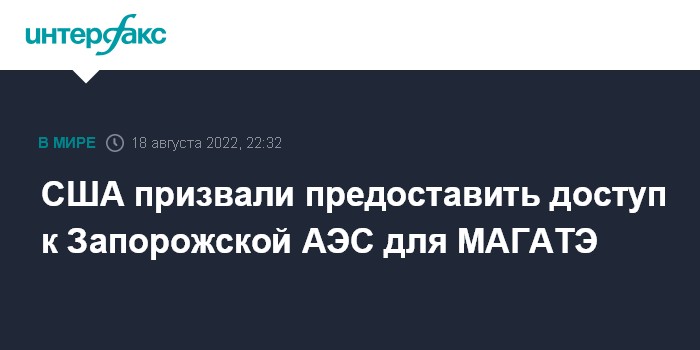 Москва. 18 августа. INTERFAX.RU - Представитель госдепа США Нед Прайс в четверг призвал обеспечить для МАГАТЭ доступ к Запорожской АЭС.