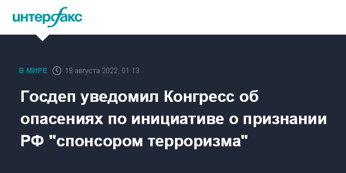 Москва. 19 августа. INTERFAX.RU - Госдепартамент США сообщил Конгрессу о своей обеспокоенности по поводу рассмотрения в Палате представителей законопроекта о признании России "государством-спонсором терроризма", пишет издание Politico со ссылкой на несколько осведомленных источников.