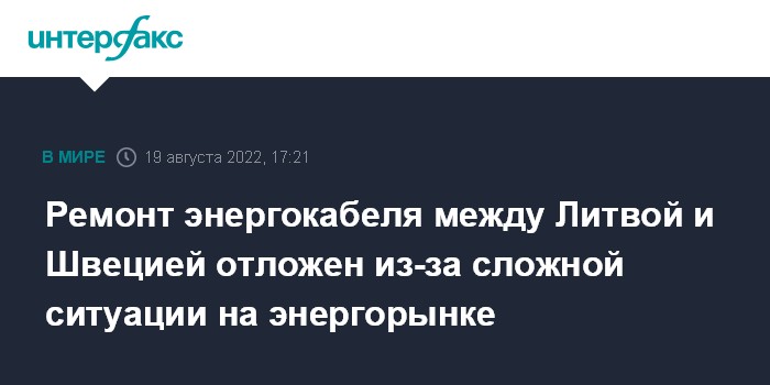 Москва. 19 августа. INTERFAX.RU - Отключение энергетического кабеля энергосмычки NordBalt между Литвой и Швецией, проходящего по дну Балтийского моря, для ежегодных работ по обслуживанию и ремонту откладываются более, чем на два месяца из-за сложной ситуации на рынке электроэнергии, сообщило Минэнерго Литвы.