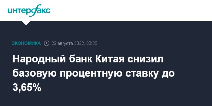 Москва. 22 августа. INTERFAX.RU - Народный банк Китая снизил базовую процентную ставку по кредитам (LPR) сроком на один год до 3,65% годовых с 3,7%.
