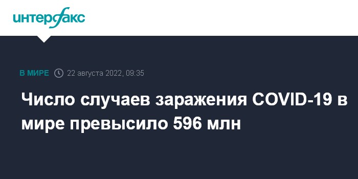 Москва. 22 августа. INTERFAX.RU - Число подтвержденных случаев заражения коронавирусом в мире на утро понедельника достигло 596 171 950, свидетельствуют данные американского университета Джонса Хопкинса.