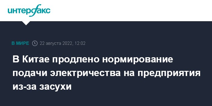 Москва. 22 августа. INTERFAX.RU - Власти провинции Сычуань продлили до 25 августа нормирование подачи электроэнергии на некоторые предприятия из-за сильной засухи, сообщает AP.