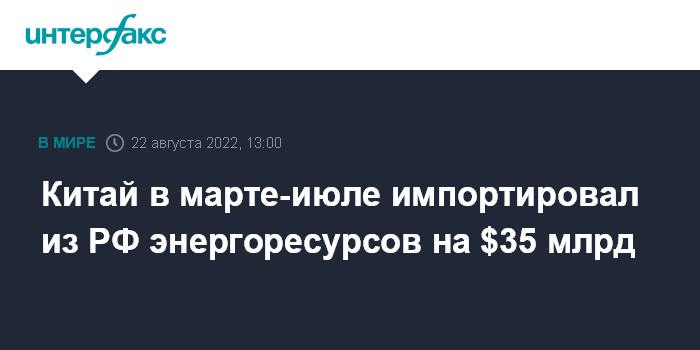Москва. 22 августа. INTERFAX.RU - Китай в период с марта по июль импортировал из России энергоресурсов на общую сумму $35 млрд по сравнению с $20 млрд за тот же период предыдущего года. Таковы подсчеты агентства Bloomberg, основанные на статистических данных таможенного ведомства КНР.