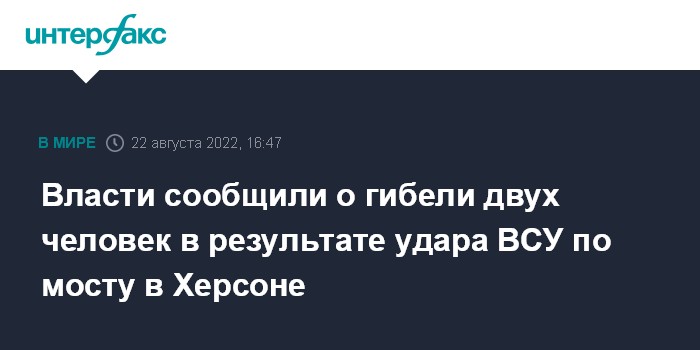 Москва. 22 августа. INTERFAX.RU - Два человека погибли и 16 пострадали в результате удара украинских войск по мосту через Днепр в Херсоне, сообщил в понедельник "Интерфаксу" заместитель главы временной администрации региона Кирилл Стремоусов.