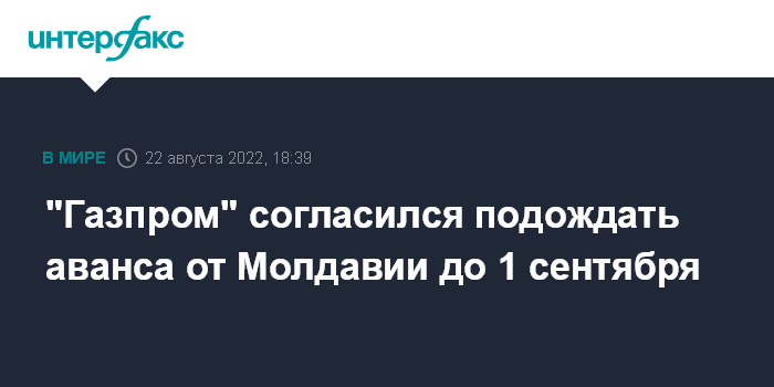 "АО "Молдовагаз" не выполнило контрактные обязательства перед ПАО "Газпром" по оплате аванса за поставки газа в августе 2022 года. В связи с этим "Молдовагаз" обратился к "Газпрому" с просьбой перенести срок оплаты аванса до 1 сентября 2022 года. "Газпром" принял решение в исключительном порядке согласиться с этой просьбой", - говорится в сообщении монополии.