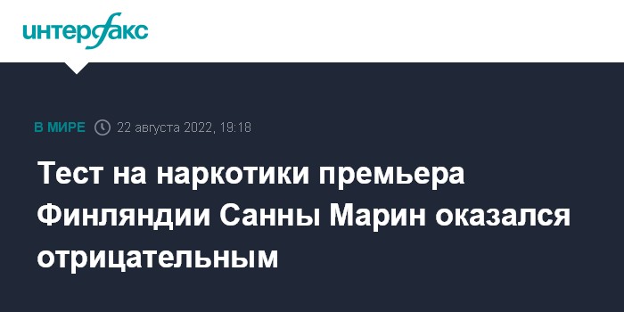 Москва. 22 августа. INTERFAX.RU - Тест на наркотики премьер-министра Финляндии Санны Марин не выявил признаков употребления наркотических веществ, сообщила в понедельник канцелярия премьера.