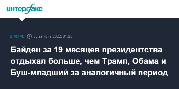 Москва. 23 августа. INTERFAX.RU - Президент США Джо Байден за 19 месяцев работы на посту американского лидера провел на отдыхе больше времени, чем его предшественники, сообщает издание New York Post.