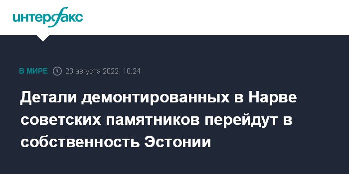 "Правительство согласилось с предложением Департамента полиции и погранохраны перевести детали убранных 16 августа из Нарвы монументов с советской военной символикой в собственность государства, и назначило распорядителем имущества министерство обороны, которое передаст детали монументов в Военный музей", - сообщило во вторник правительство республики.