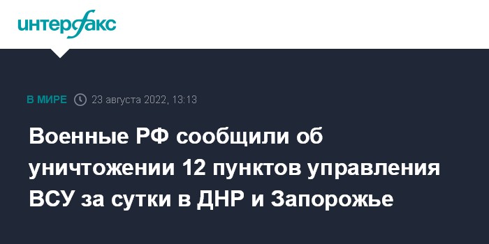 Москва. 23 августа. INTERFAX.RU - Минобороны РФ заявило, что российские войска за сутки уничтожили 12 пунктов управления армии Украины в ДНР и Запорожской области.