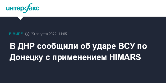 Москва. 23 августа. INTERFAX.RU - Украинские военные нанесли по центру Донецка удар с применением реактивных систем залпового огня HIMARS, есть погибшие и раненые, сообщает Совместный центр контроля и координации режима прекращения огня (СЦКК) Донецкой народной республики.