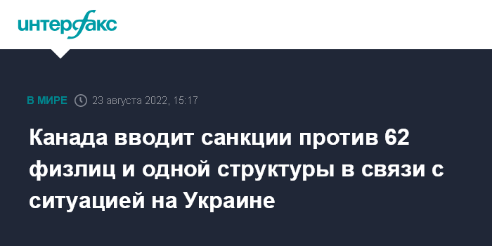 Москва. 23 августа. INTERFAX.RU - Канада вводит санкции в отношении 62 физических лиц и одной структуры, связанных с российской спецоперацией на Украине, сообщил во вторник канадский премьер-министр Джастин Трюдо.