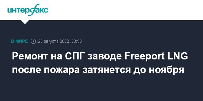 Москва. 23 августа. INTERFAX.RU - Американский завод СПГ Freeport LNG сообщил о новой задержке в ходе ремонтных работ после пожара: если раньше компания планировала возобновить полноценную деятельность в начале октября, то теперь речь идет о начале-середине ноября, заявила Freeport LNG Development, L.P.