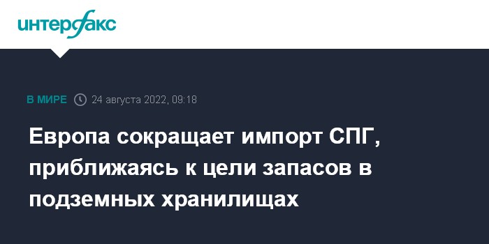 Москва. 24 августа. INTERFAX.RU - Европа сокращает импорт дорогого сжиженного природного газа по мере приближения целевого (80%) уровня запасов в хранилищах.