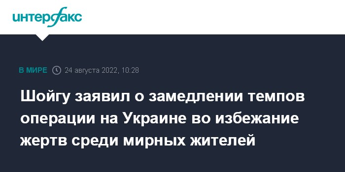 Москва. 24 августа. INTERFAX.RU - Замедление темпов наступления в ходе специальной военной операции на Украине - сознательное решение, оно обусловлено стремлением минимизировать жертвы среди мирного населения, заявил министр обороны РФ Сергей Шойгу на совещании министров обороны стран - участниц ШОС в среду.