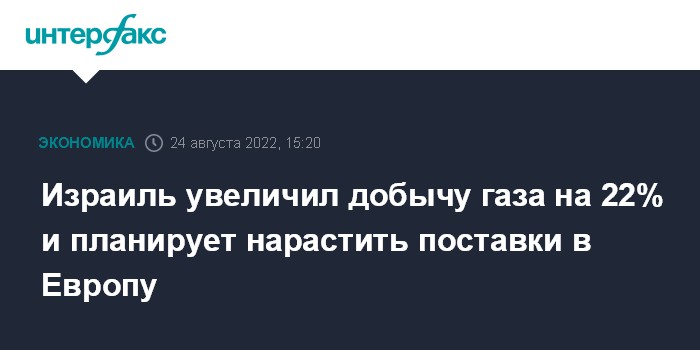 Москва. 24 августа. INTERFAX.RU - В первом полугодии 2022 года добыча газа в Израиле увеличилась на 22% в годовом исчислении и составила 10,85 млрд кубометров, страна готовится наращивать экспорт газа Европу, говорится в отчете израильского Министерства энергетики.