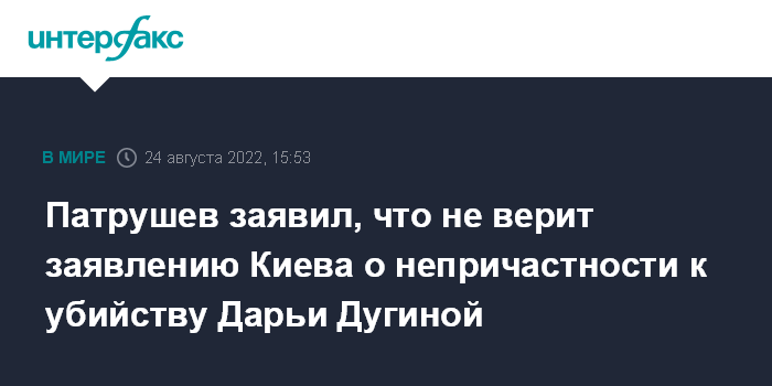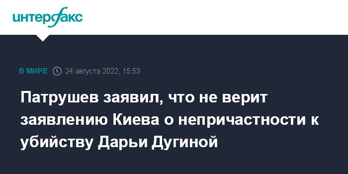 Москва. 24 августа. INTERFAX.RU - Секретарь Совета безопасности РФ Николай Патрушев сообщил, что не верит заявлению Киева о непричастности к убийству журналистки Дарьи Дугиной.