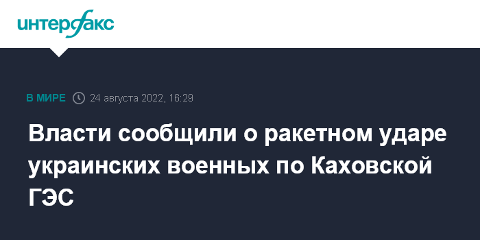 Москва. 24 августа. INTERFAX.RU - Территория Каховской ГЭС в Херсонской области подверглась в среду обстрелу из американских реактивных систем залпового огня HIMARS со стороны Украины, сообщил "Интерфаксу" глава администрации Новокаховского городского округа Владимир Леонтьев.