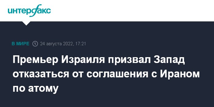 Москва. 24 августа. INTERFAX.RU - Премьер-министр Израиля Яир Лапид призвал западные страны не подписывать соглашение с Ираном по восстановлению Совместного всеобъемлющего плана действий (СВПД) по атому.
