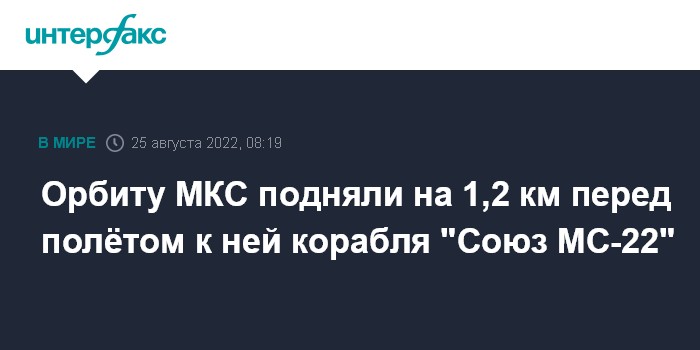 Москва. 25 августа. INTERFAX.RU - Двигатели грузового корабля "Прогресс МС-20" скорректировали высоту орбиты Международной космической станции (МКС) на 1,2 километра перед полётом к ней корабля "Союз МС-22", сообщила в четверг российская госкорпорация "Роскосмос".