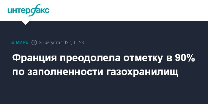 Москва. 25 августа. INTERFAX.RU - По данным на утро четверга, Франция довела до 90,06% резервы газа, предназначенные для предстоящей зимы, сообщила газета Lе Figaro со ссылкой на европейскую платформу Agregated Gas Storage Inventory (AGSI).