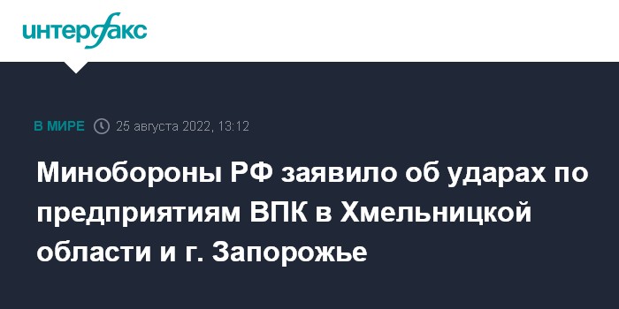 Минобороны РФ заявило об ударах по предприятиям ВПК в Хмельницкой области и г. Запорожье