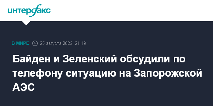 Москва. 25 августа. INTERFAX.RU - Президенты США и Украины Джо Байден и Владимир Зеленский поговорили по телефону и обсудили вопросы, связанные с Запорожской АЭС, а также меры поддержки Украины, сообщили в Белом доме.