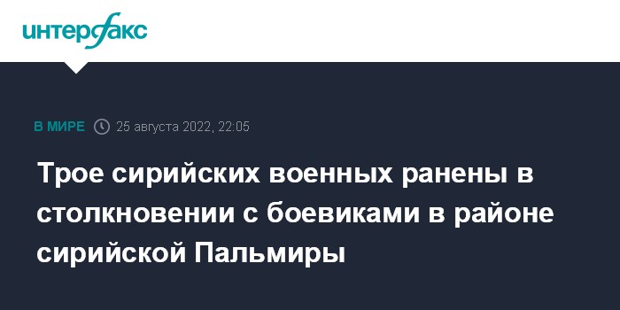 Москва. 25 августа. INTERFAX.RU - В ночь на четверг в нескольких десятках километров от Пальмиры в ходе боестолкновения с боевиками были ранены трое сирийских военнослужащих, сообщили российские военные.
