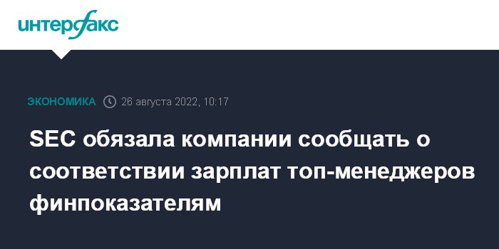 Москва. 26 августа. INTERFAX.RU - Комиссия по ценным бумагам и биржам (SEC) США обязала компании отчитываться перед акционерами о том, как соотносится уровень зарплат топ-менеджеров с финансовыми показателями самих компаний.