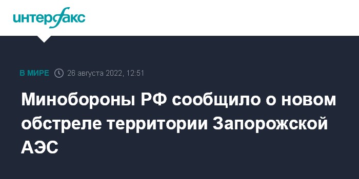 Москва. 26 августа. INTERFAX.RU - Запорожская АЭС вновь подвергалась обстрелам украинских войск из крупнокалиберных артиллерийских орудий, сообщил официальный представитель Минобороны РФ Игорь Конашенков.