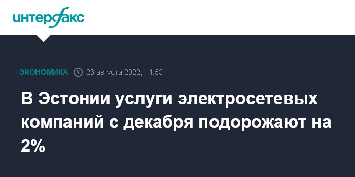 Москва. 26 августа. INTERFAX.RU - Департамент конкуренции Эстонии согласовал повышение с 1 декабря стоимости услуг электросетевых компаний на 2%, сообщило крупнейшее сетевое предприятие страны Elektrilevi (входит в государственный концерн Eesti Energia).